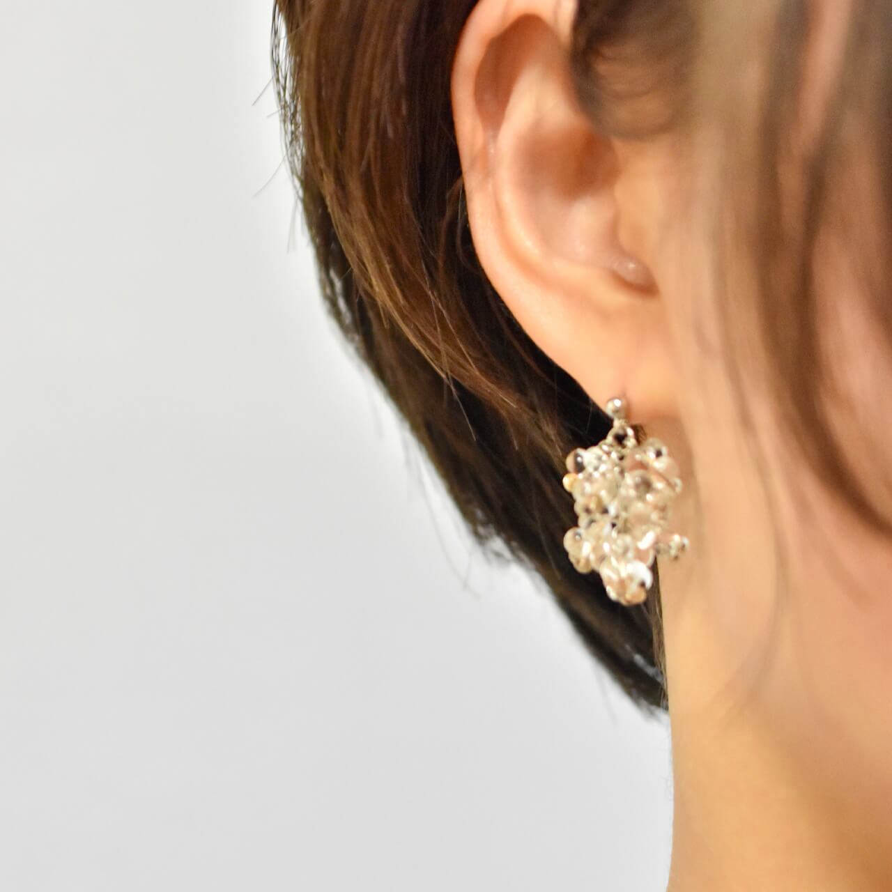 とろっと溶けたサイズ違いのビーズをたっぷり使用し、透明な花のピアスを作りました。