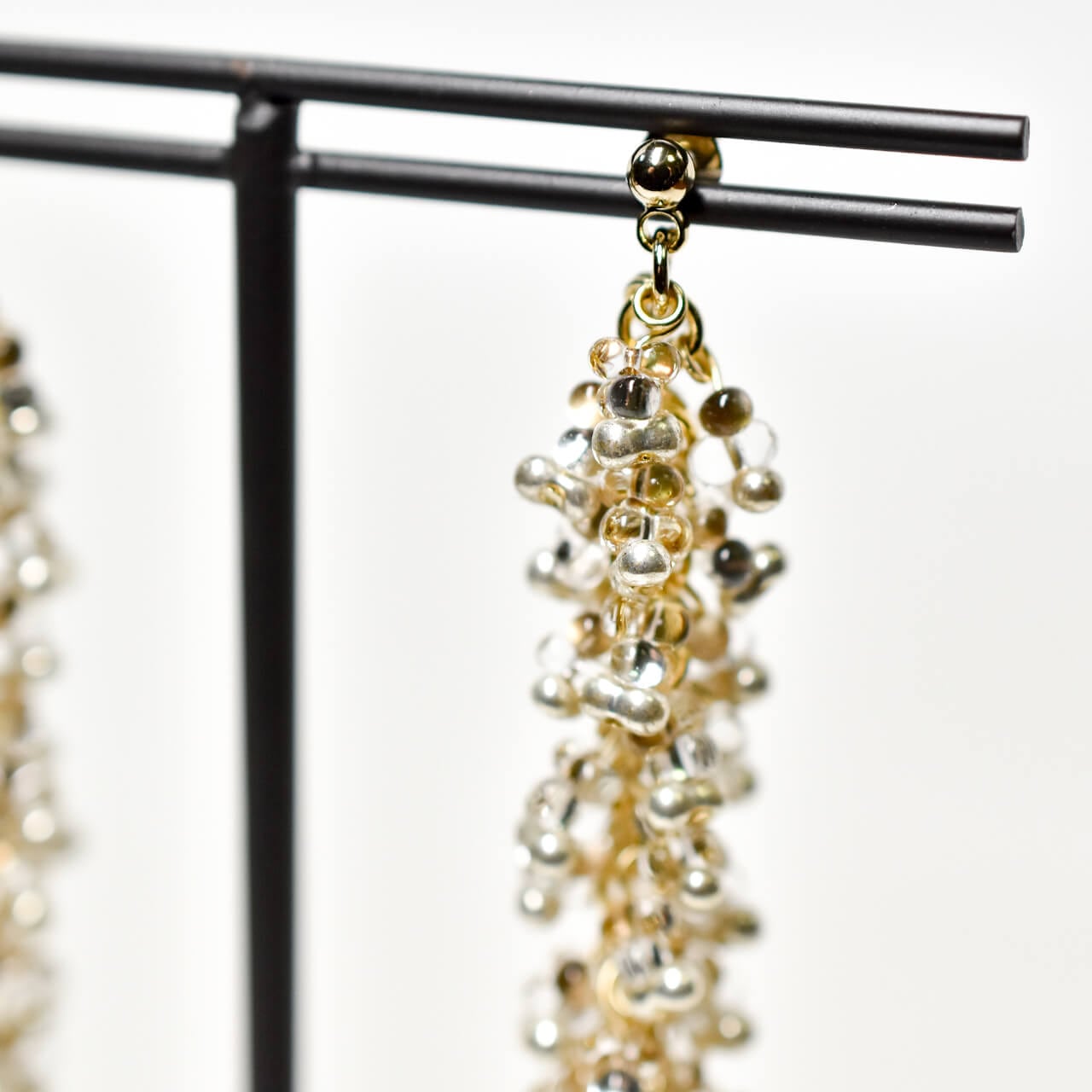 とろっと溶けたサイズ違いのビーズをたっぷり使用し、細かく丁寧に43個のパーツを繋ぎました。